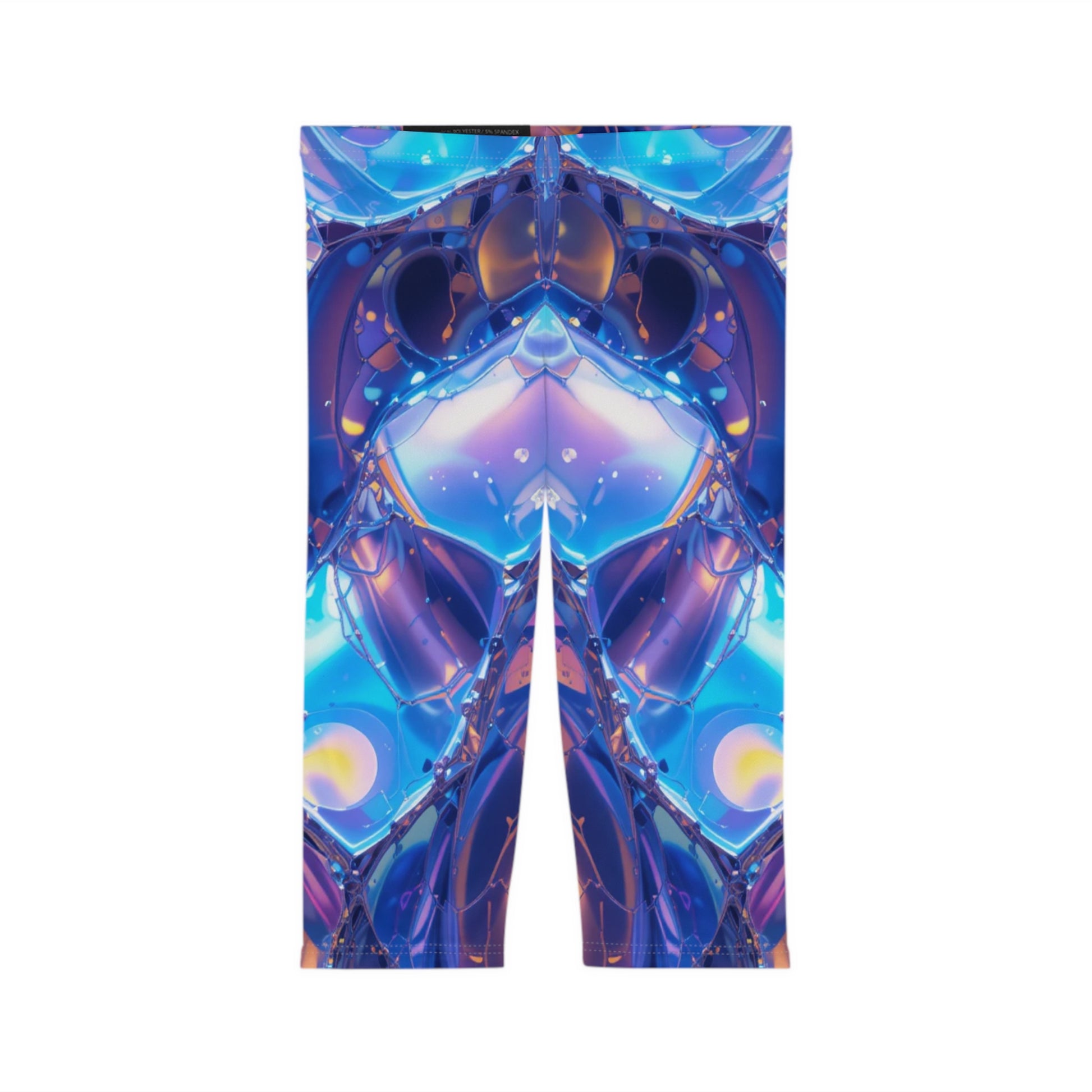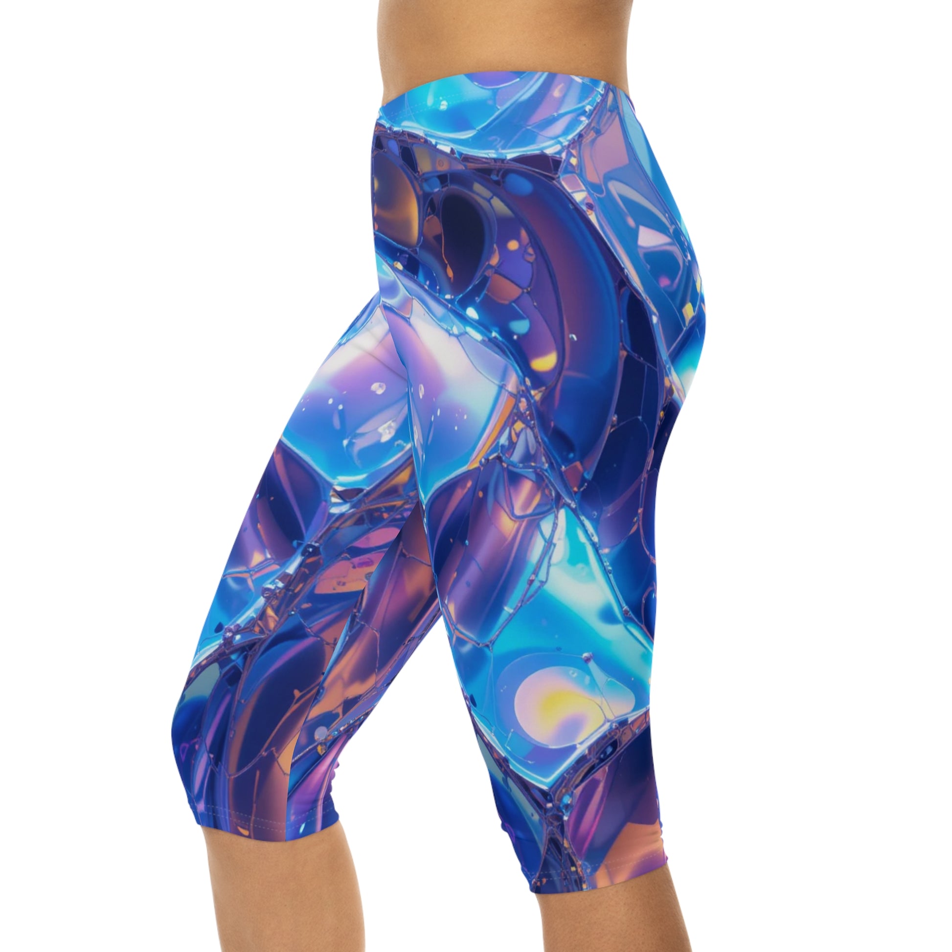 Vibrant Women's Capri Leggings with an Abstract Blue Design. These leggings are perfect for active women who want to stand out with a unique and colorful look. Ideal for yoga, running, or just lounging around the house. Great for gifting on birthdays, Mother's Day, or as a special treat for yourself.