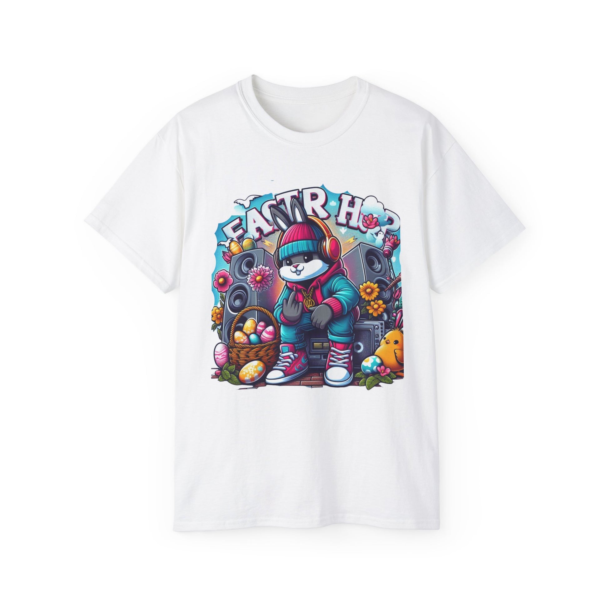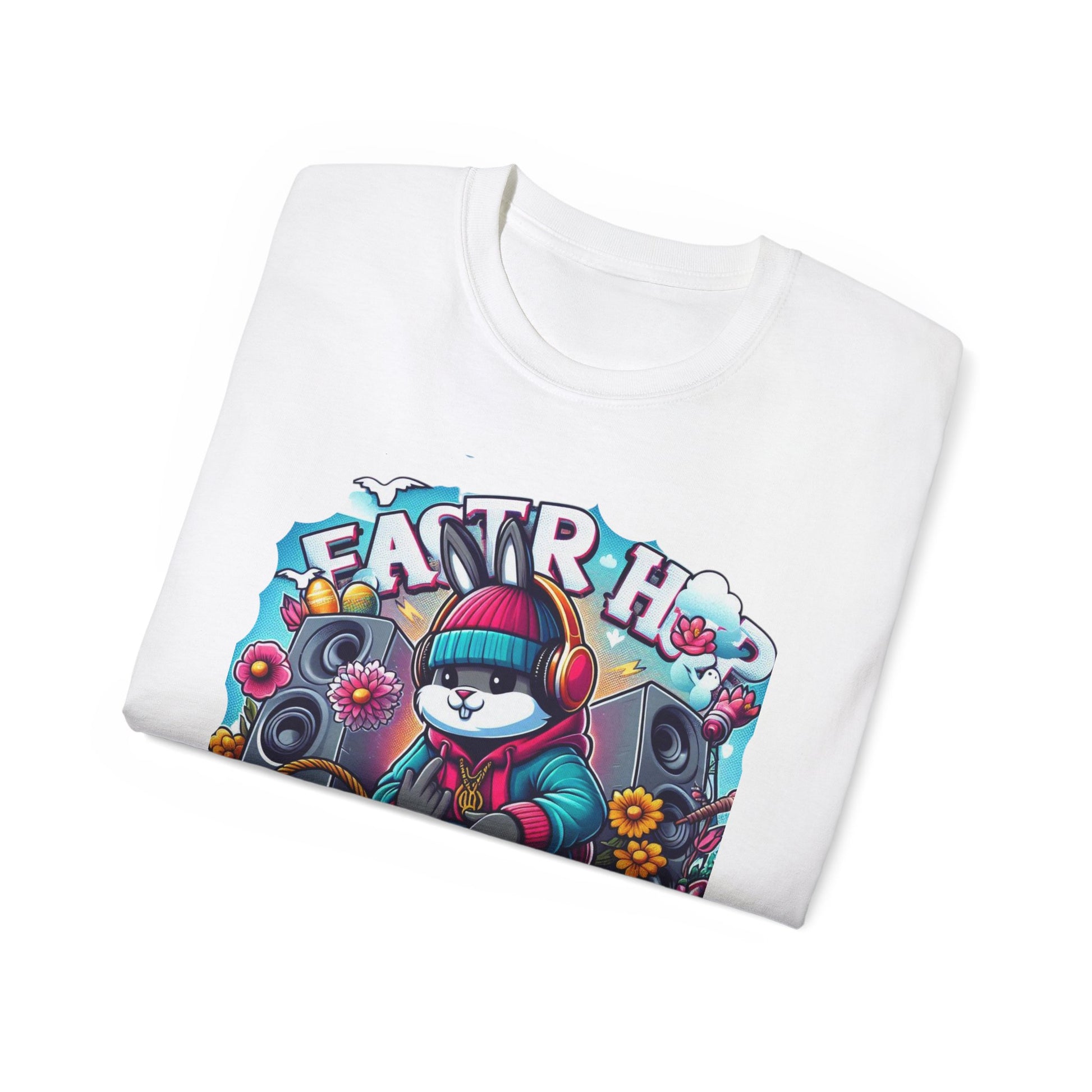 Hip Hop Bunny T-Shirt - Fun Easter Streetwear. This unisex tee is perfect for those who enjoy streetwear fashion with a playful twist. It's a great addition to any casual wardrobe and can be worn during the Easter season to add a festive touch to your outfit.